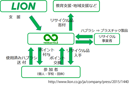 注1:使用済みの歯ブラシ(1単位200本)を集めてリサイクルする運動の事であり、歯ブラシの本数に応じてリサイクルされた各種園芸用品やリサイクルポイントを受け取る事が出来る。またリサイクルポイントを教育支援・地域支援組織へ寄付する事も出来る。