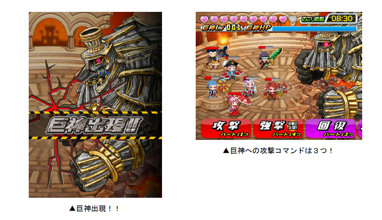 “ハート”を消費して実行する「攻撃」「強撃」「回復」の3種類のコマンドを使って巨神を攻撃します。