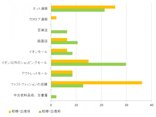 ●結婚・出産前はショッピングモールが多数、結婚・出産後はファストファッションが多数