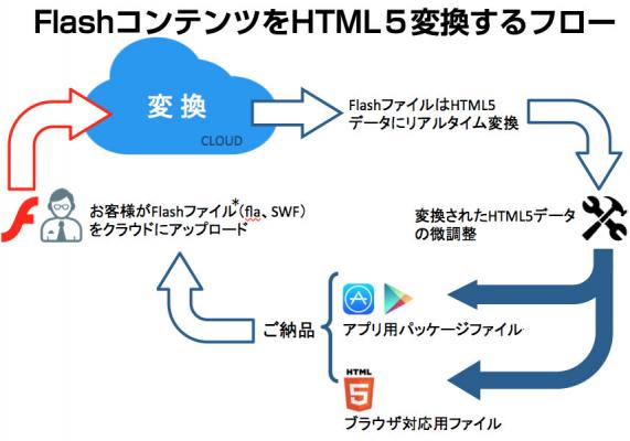 Flashコンテンツ作成に多くの制作費を投じてきた企業は、当サービスを利用することにより短納期で安価にHTML5に変換が可能であり、iPhoneやAndroidなどFlashPlayerを搭載していない端末向けに過去のコンテンツ資産を再利用することが可能となります。