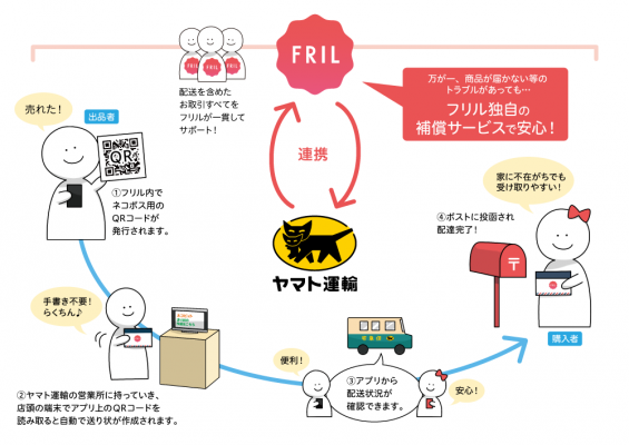 このたび、9月上旬よりFablicとヤマト運輸は連携し、アプリ内での配送手配だけで、「ネコポス」をリーズナブルかつ便利にご利用いただけるサービスを提供します。さらにFablicはフリル独自の新たな補償サービス「フリルあんしん補償」を「ネコポス」に適用し、「フリル」ユーザーがより安心してファッションを楽しめるよう、個人間取引をトータルでサポートします。