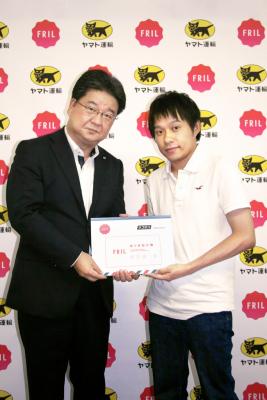 フリルオリジナルデザインのネコポス専用パッケージを持つ(株)Fablic 代表取締役 堀井翔太(右)とヤマト運輸(株) 執行役員法人営業部長 小菅泰治(左)