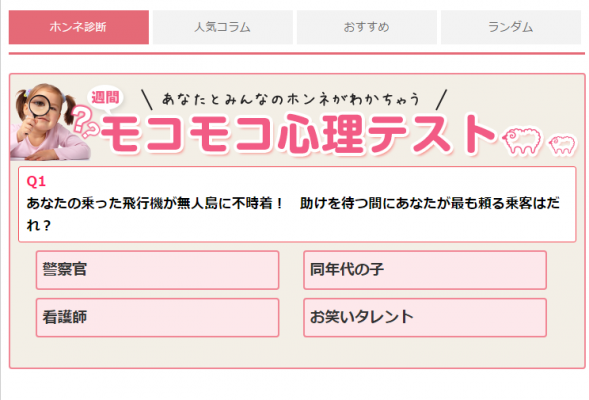 mocomocoは女性の知りたいホンネや、生活のやりくり情報をお届けするWebマガジンのサイトで、診断システムを導入したことで、よりサイトに活気をもたらすとともに、ユーザに楽しんでもらえるようになりました。