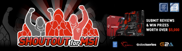 2015年8月13日~9月13日に、MSI Z170マザーボードをお使いの方すべてがこのMSIにシャウトアウトするキャンペーンに参加することができます。参加するには、オンライン上のフォーラム、ブログなどのプラットホームの上にマザーボードのレビューを掲載し、そのことをMSIのシャウトアウト用イベントページに報告するだけです。そのシャウトアウトのお礼として、参加者にはIntel 750シリーズSSD、G.skill DDR4メモリ、SteelSeries APEX Gaming Keyboard、G2Aの20ユーロのギフトカードなどを含む賞品が当たるチャンスが得られます。