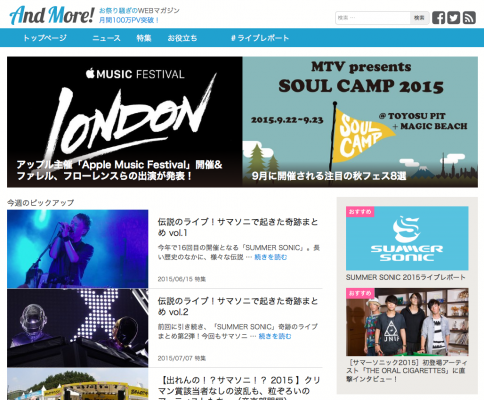 昨今、多種多様なフェスティバルが登場してきており、その人気は今後もますます広がりを見せております。そんな中で『AndMore!』は、フェスの魅力やお役立ち情報の記事を配信しています。中でも関心の高い記事は20万PVを超えるなど読者の皆さまより高い評価をいただき、ソーシャルメディアにも拡散されています。現在Yahoo!チケット エンタミ、LINE NEWSとニュース・キュレーションサイトへの記事配信も開始いたしました。