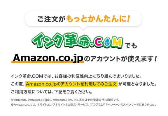 初めてインク革命.COMを利用される方でも、Amazon.co.jpのお客様であればAmazonアカウントでログインし、Amazonアカウントに登録されている名前や配送先などを利用することができ、新規登録の際の情報入力の手間を省ける仕組みになっています。