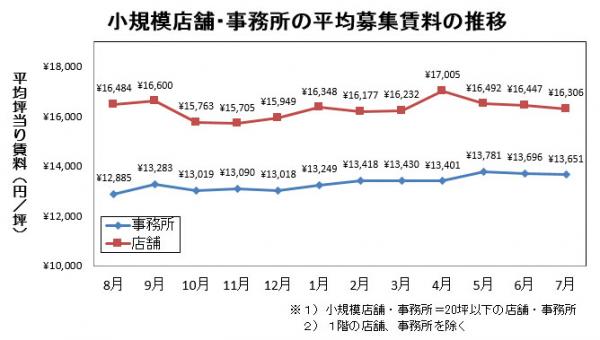 池袋の小規模事務所(20坪以下)の7月度平均募集賃料は、前月から0.3%下降しましたが、前月並みの1.3万円台半ばに落ち着いています。
