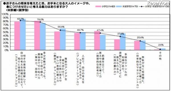 2012年10月に発表された「子どもに身につけさせたい能力ランニング(オフィス通販のカウネットが運営する働く女性のコミュニティサイト「わたしみがき」が発表)」では、上位に「コミュニケーション力」「集中力・忍耐力」「想像力・チャレンジ力」など、既存の義務教育過程では十分に学ぶことが困難な能力が占められています。