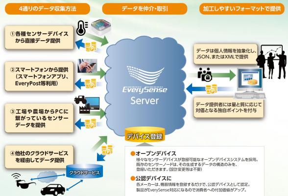 EverySenseサービスで貯まったEverySenseポイントは、エブリセンスが提携をしているポイント交換サイト 「PointExchange」(http://www.point-ex.jp/)を利用し、ギフト券や現金、他社のポイントに交換することが可能となります。また、貯まったEverySenseポイントを使ってデータ利用者となり、他の人のデータを入手することも可能となります。