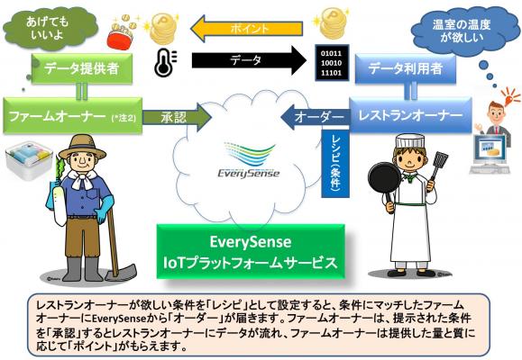 エブリセンスは、データを持っている提供者を『ファームオーナー』と呼び、そのデータを利用したいという人を『レストランオーナー』と呼んで、両者を仲介するIoTプラットフォームサービスを提供します。