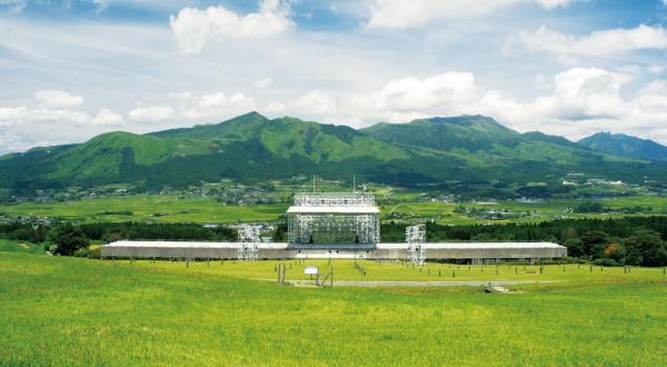 南阿蘇の息を飲むほど壮大な大自然の中に設立された国内最大級の野外ステージ「アスペクタ」の前で、