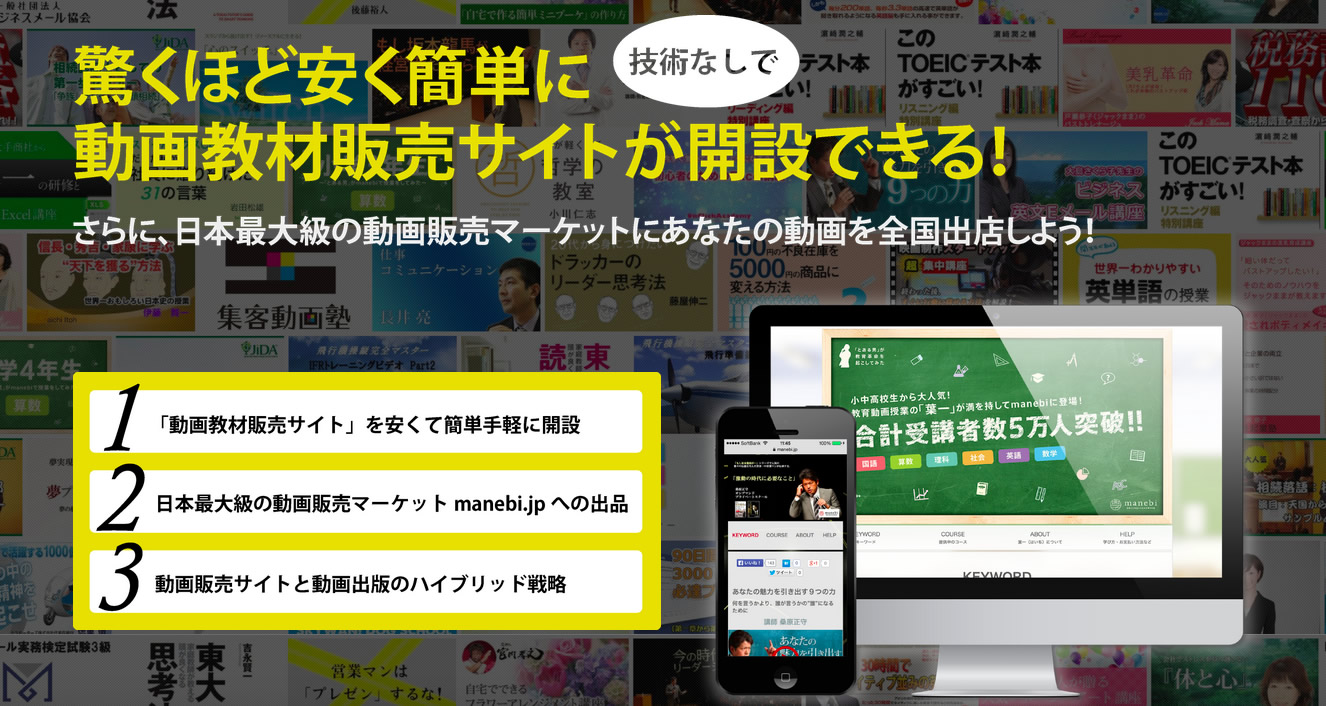 株式会社manebiが提供する、塾やスクール運営事業者様が誰でも安価で簡単にオンラインアカデミーを開設でき、まるでショッピングサイトの様なインターフェースで展開できるプラットフォームサービスです。