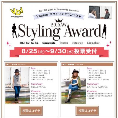 ファッション、ヘアメイク、ビューティ、グラフィックデザイン、映画映像、フォト、ゲーム、アニメ、マンガ、パティシエ、カフェ、フードコーディネーターなどのクリエイティブ分野に特化し、即戦力人材を育成するスクール運営事業を行っているVantan(バンタン)(本部所在地:東京都渋谷区 代表取締役専務:石川広己) は、バンタンデザイン研究所と「RETRO GIRL(レトロガール)」や「Emsexcite(エムズエキサイト)」等、レディース、キッズを幅広く扱うファッションブランドを展開する株式会社エムズとのコラボレーションにより、学生たちが「RETRO GIRL」と「Emsexcite」の秋冬アイテムを使用したスタイリングを企画し、WEBを通じて一般投票を行いグランプリを決定するスタイリングコンテスト『Styling Award 2015AW』を実施致します。