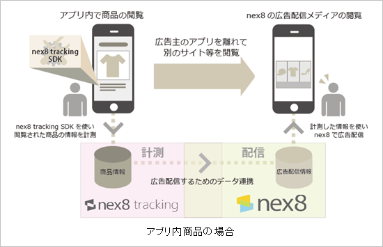 ダイナミックリターゲティング広告はWebサイト内商品におけるプロモーションから始まり、徐々に市場が拡大してきている状況で、nex8でも、人材・不動産・アパレル系広告主様を中心に需要が高まってきています。Webサイト内商品においては広告主サイトにjavascriptタグを埋め込むことでトラッキングを行いますが、アプリではjavascriptタグの埋め込みができないため、nex8では今回、nex8の配信サポートツールであるnex8 tracking(ネックスエイトトラッキング)<https://tracking.nex8.net/>と連携することで、アプリ内商品においてもダイナミックリターゲティング広告配信を実現しました。