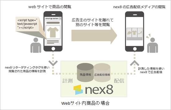 また、独自に開発したシステムにより、ユーザーが商品一覧ページを閲覧して離脱したのか、詳細ページまで閲覧したが申込・購入に至らなかったのかなど、ユーザー行動の段階に応じて配信内容を細かくチューニングできることが、「nex8ダイナミックリターゲティング」の特長です。
