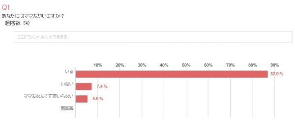 ママ友がいるママさん達は87%もいらっしゃいました。ママさん同士、情報交換や、家事・育児などの悩みを聞いてもらいたい!という考えの方もいるのかもしれません。