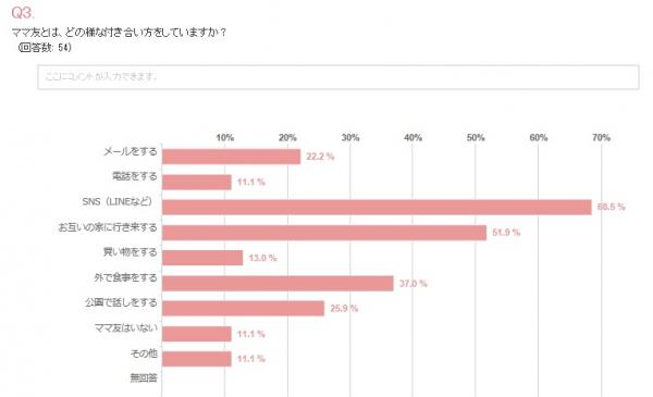 ママ友との連絡方法は、SNS(LINE)68.5%、メール22.2%、電話11.1%という事が分かり、メールよりもLINEで連絡を取っているママさん達が多い事が判明しました!また、お互いの家に行き来するママさんは51.9%、外で食事をするママさんは37%という結果になり、買い物をするママさんは13%と、以外にも少ない事が分かりました。外で会うより、携帯などでお話ししたり連絡を取っているママさん達が多い様です。