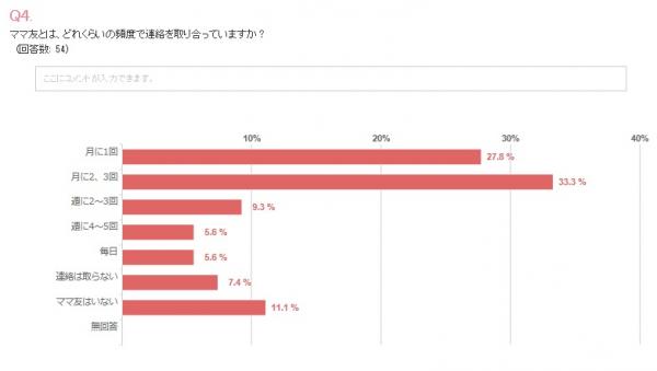 ママ友同士で連絡を取り合うのは、月に2~3回が33.3%、月に1回が27.8%というママさん達が最も多い事が分かりました。毎日連絡を取っているママさんは5.6%いらっしゃいました。ママ友と接するのが好きなママさん達もいるのかもしれません。適度な距離をおき、良いママ友関係を続けてくには頻繁に連絡を取り合わない、と考えているママさん達もいるようです。
