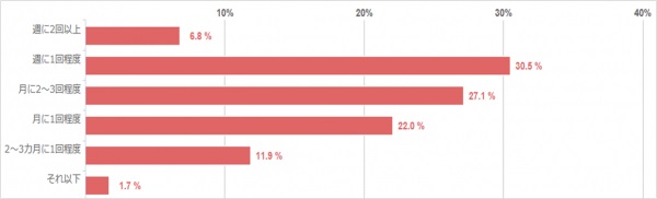 「週に1回程度」が最も多く、30.5%でした。「月に2~3回程度」「月に1回程度」がそれぞれ27.1%と22.0%で、「週に2回以上」が6.8%なので、8割以上のご家庭は月に1度は全員で外食に行っていることがわかりました。