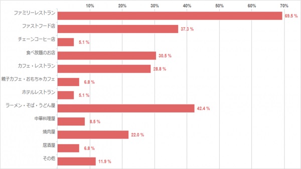 意外にも低かったのが「親子カフェ・おもちゃカフェ」の6.8%でした。子連れ飲食に特化しているお店ですが、家族全員ではあまり利用されていないようです。ママ友などとの利用が多いのかもしれません。