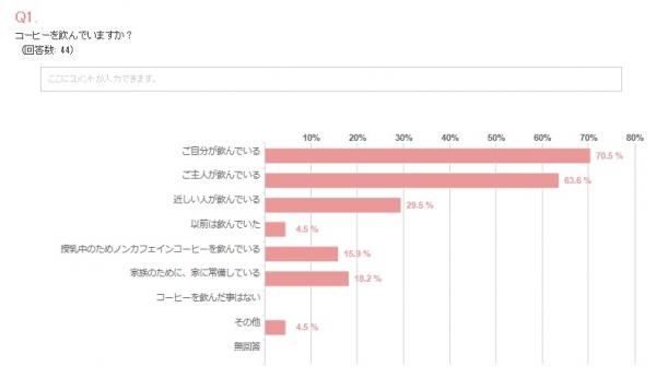 コーヒーを「自分が飲んでいる」というママさんは70%もいらっしゃり、「ご主人が飲んでいる」ご家庭は63.6%いらっしゃる事が分かりました。また、授乳中のママさんは「ノンカフェインコーヒー」を飲んでいる事も判明しました。