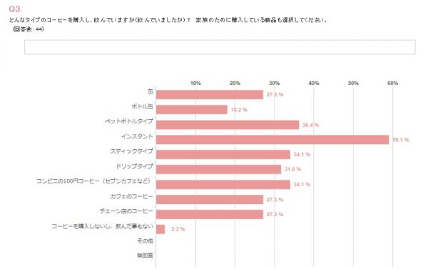 ご家族で淹れたてコーヒーを楽しめる「インスタントコーヒー」が59.1%と最も多く、また「スティックタイプ」や「ドリップタイプ」のコーヒーもママさん達に人気があるという事が分かりました。そして、外出時には「コンビニコーヒー」を購入し、飲まれている事も判明しました。
