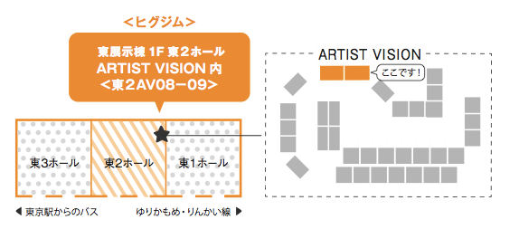 会期は9月2日(水)~4日(金)の3日間、ヒグジムは東展示場1階、2ホール奥、「ARTIST VISION」(デザイナーやイラストレーターなどのクリエイターが集まったコーナー)の「東2AV08-09」にブースを構えています。