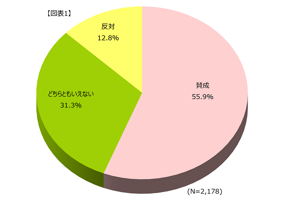 全体では「賛成」が半数以上(55.9%)で最も高く、次いで「どちらともいえない」(31.3%)となっています。