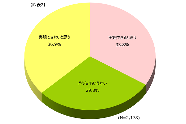 全体では「実現できないと思う」(36.9%)が最も高いものの、僅差で「実現できると思う」(33.8%)が続いており、実現の可能性に対する考え方が二分しています。