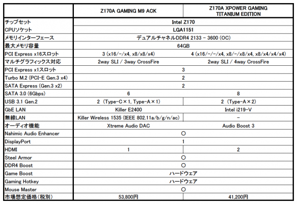 2015年8月28日 -Micro-Star International Co. Ltd., 台湾・新北市- Micro- Star International Co. Ltd.(MSI)は、Intelの第6世代Coreプロセッサに対応したIntel Z170チップセット搭載高性能マザーボード「MSI Z170A Enthusiast GAMINGシリーズ」に、究極のゲーム体験をもたらすフラグシップモデル「Z170A GAMING M9 ACK」と、オーバークロック性能を突き詰めた「Z170A XPOWER GAMING TITANIUM EDITION」の2モデルを追加し、8月29日より店頭販売を開始いたします。市場想定価格(税別)は、Z170A GAMING M9 ACKが53,800円、Z170A XPOWER GAMING TITANIUM EDITIONが41,200円です。