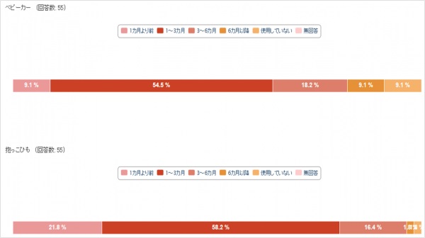 どちらも、「1~3カ月」の時に使用を開始した方が最も多く、ベビーカーは54.5%、抱っこひもは58.2%でした。