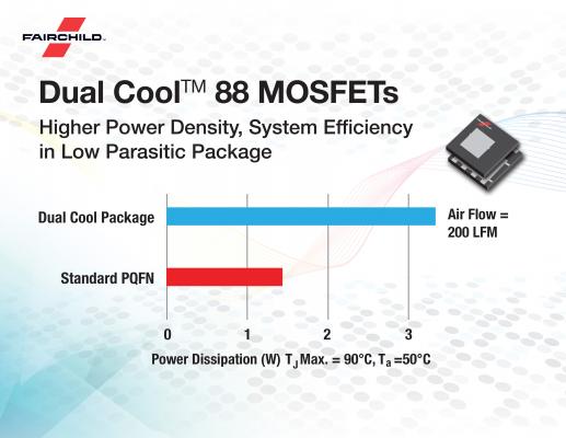 本日(2015年9月1日)、フェアチャイルドセミコンダクタージャパン株式会社(本社:東京都渋谷区、社長:神戸 肇、以下フェアチャイルド・ジャパンと略)は、8mm 角Dual Coolパッケージ(“Dual Cool 88”)を採用した高性能中耐圧MOSFETを発表しました。新製品の”Dual Cool 88” MOSFETは、従来のD2-PAKパッケージを置き換えうる製品で、半分のサイズでありながら、より大きな許容損失を有し、パッケージ下部及び上部の放熱板から放熱することにより、より高い電力効率と放熱特性を実現します。