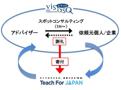 今回の取り組みでは、「ビザスク」を通じて得られるスポットコンサルティングの謝礼の受取方法を“寄付”にしているアドバイザーがスポットコンサルティングを実施した場合、ビザスクよりTeach For Japanに対して寄付が行われる仕組みとなります。(アドバイザーは謝礼受取方法を(1)口座振込(2)商品券(3)寄付より選択可能)