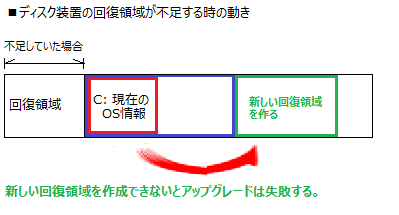 このためディスクは充分な空き領域が在るはずなのに、回復パーテーションが容量不足でアップグレードに失敗するという現象が発生します。