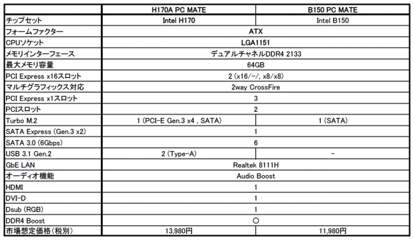 2015年9月2日 -Micro-Star International Co. Ltd., 台湾・新北市- マザーボード技術で世界を牽引するMicro-Star International(MSI)は、ビジネス向けマザーボード「PROシリーズ」の最新モデルとして、Intel H170およびIntel B150チップセットを採用した「H170A PC MATE」と「B150 PC MATE」を本日9月2日より発売いたします。これら両製品は、ビジネス用途を意識し、Skylakeでは標準サポートされていないVGA出力を備えるなど、ビジネスの現場に必要とされる機能を詰め込んでおり、大きな生産性向上に寄与します。Windows 10 WHQL認証を追加したPROシリーズマザーボードは、最高の安定性、セキュリティ、そして信頼性を提供し、技術的な創意工夫だけでないありあまるほどの新しい機能と進化を見せています。なお、両モデルの市場想定価格(税別)は、それぞれ13,980円、11,980円の見込みです。