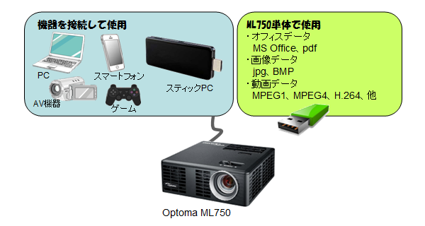 手のひらサイズのML750だけで、プレゼンや動画上映も可能になります。