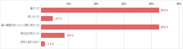 「暑かった」と感じた方と「暑い期間があっという間に終わった」と感じた方が同数で42.9%でした。地域によっても違うかと思いますが、「雨の日が多かった」と感じた方もいらっしゃいました。