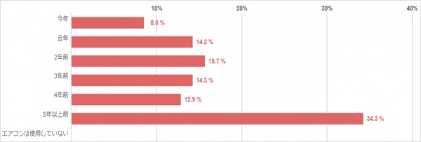最も多かったのは「5年以上前」で34.3%でした。新しいエアコンのほうが電気代が安くなったり、様々な昨日が付いていますが、やはり本体の価格や設置費が高いために、なかなか購入に踏み切れないようです。