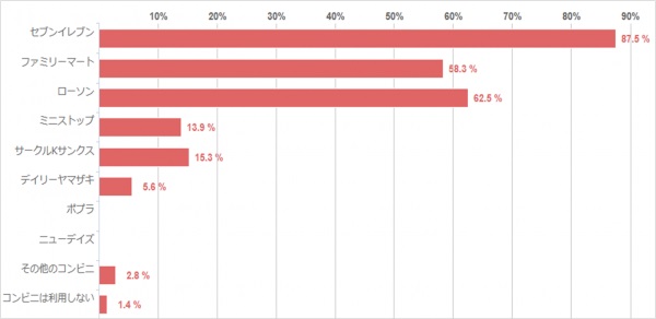 87.5%のママさんが「セブンイレブン」をよく利用していることが分かりました。また「ファミリーマート」「ローソン」は半数以上のママさんに利用されており、やはり店舗数が多いコンビニがよく利用されているようでした。