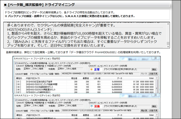 この新しい本機能は、ドライブ故障統計(ビッグデータ)を解析いたしまして、実際に故障を起こしたモデルを中心にその故障の時期・タイミング・理由を細かく解析・分類いたしまして、文章にまとめてから出力する機能となっております。