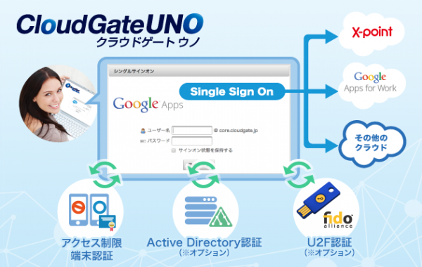 この度のCloudGate UNOとX-pointの連携により、CloudGate UNOを経由して一度ログイン済みであれば、X-pointにもシングルサインオンでアクセスできるようになり、サービスを利用するユーザーにとって、複数回のログインストレスから解放されます。また、企業の管理者にとっては、アクセスコントロールやアカウント管理をCloudGate UNOで一元管理できることから、情報漏えい対策やコンプライアンスの観点でより安心安全にGoogle AppsとX-pointを運用できるメリットがあります。昨今のビジネスシーンにおけるクラウドの利活用では、単なるシングルサインオンに留まらず、より厳格な本人認証による企業の情報資産へのログイン認証が求められております。CloudGate UNOは、2015年6月に「脱パスワード」を目的とするFIDO Alliance(*1)の認証規格に対応いたしました。これにより、X-pointにCloudGate UNOのFIDO認証を適用することが可能となっています。
