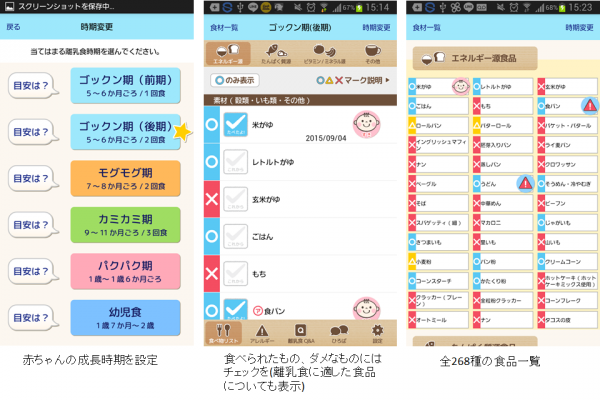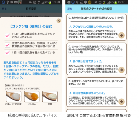 離乳食に関する知識はこのアプリに詰まっているため、アレルギーや栄養面の心配、成長に応じて食べられる食材の変化まで確認できます。