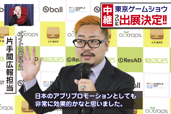インターネット広告事業を展開する株式会社ファンコミュニケーションズ(本社:東京都渋谷区、代表取締役社長:柳澤安慶 東京証券取引所市場第一部:2461)の連結子会社、株式会社エイトクロップス(本社:東京都渋谷区、代表取締役社長:細野耕平)は、2015年9月17日から幕張メッセにて開催される「東京ゲームショウ 2015」に、スマートフォンアプリ向けCPI(※1)広告ネットワーク「adcrops(アドクロップス)」<https://adcrops.net/>を出展いたします。