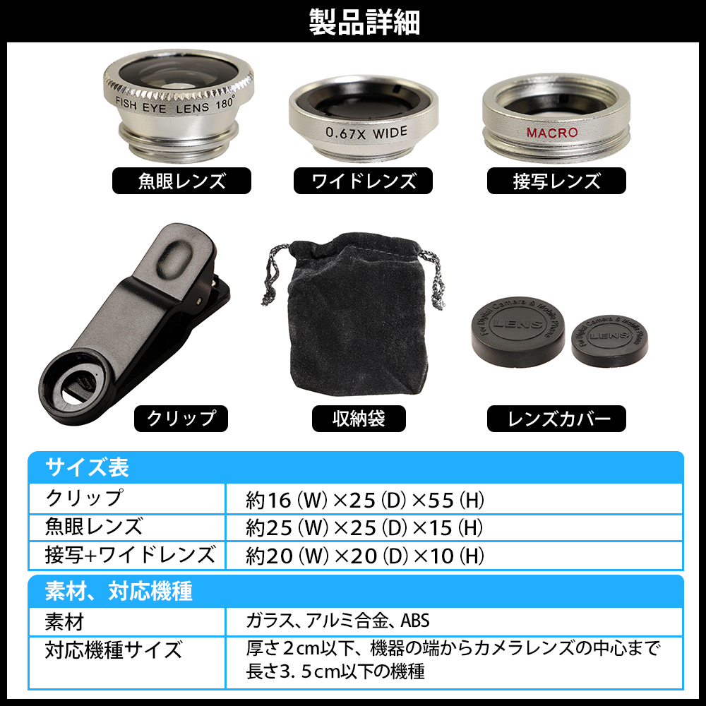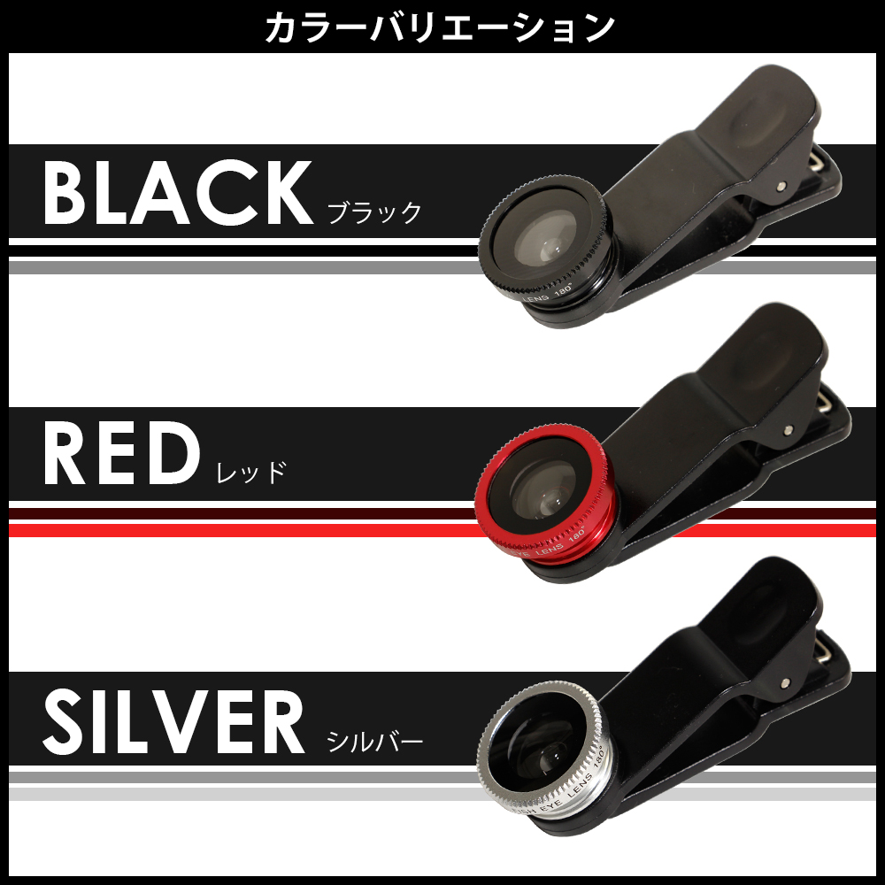 魚眼レンズ、ワイドレンズ、接写レンズの3種類がセットになっているのでいろんな写真を撮影可能!