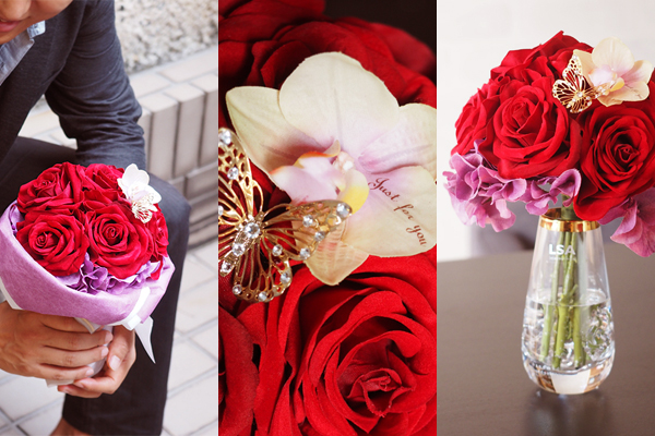 重厚感のある真っ赤なバラの上には、きらめくゴールドの蝶々を配置し、女性が喜ぶ可愛らしさを演出しました。さらにその蝶の先には、メリアルーム商品の特徴ではるオリジナルフラワーメッセージや彼女の名前を忍ばせ、特別感を表現しています。