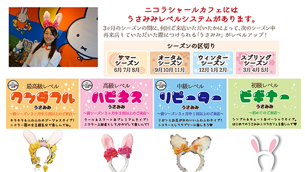 さらに、前シーズン3ヶ月間の来店回数によって、翌シーズンに身につけられるうさ耳がレベルアップしていきます!お友達と来店したとき、一人でにも高いレベルの会員様がいれば、全員高いレベルのうさ耳がつけられるよ!