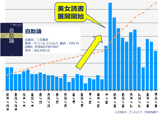 6月8日より全国約400書店にて開催したフェア第1弾では、5人の美女が「生き方を変える自己啓発書」全5タイトルを紹介しました。拡材を用いた魅力的な売場作りをしていただいた書店も多く、各タイトルが売上を伸長させました。特に、『自助論』(三笠書房)は企画開始直後に売上を約5倍伸長させるなど、大きな効果を上げました。(添付資料:週別の売上冊数推移)
