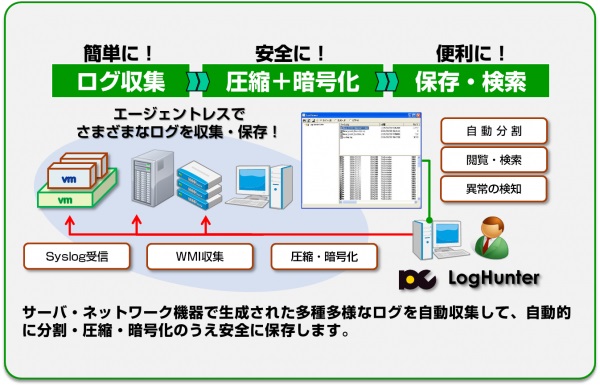 ログ収集・保存ツール「ログハンター(LogHunter)」は、サーバ・ネットワーク機器から生成された多種多様なログを自動収集して、ログの安全性を高めるために自動的に圧縮・暗号化のうえ保存します。