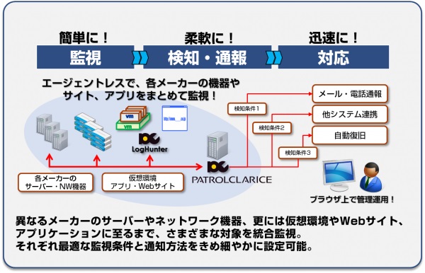 「ログハンター」によりサーバー・ネットワーク機器のログを収集・暗号化し、 収集されたログは「パトロールクラリス」によって常時監視され、異常が発生すると様々な方法で即時通報されます。