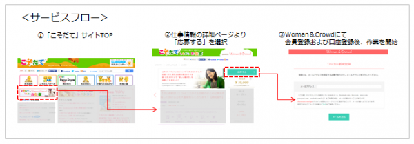 「こそだて」サイト内にて「ママの新しい働き方 家職(うちしょく)-こそだてしながらお仕事」の名称で仕事情報を掲載することで、「こそだて」を閲覧する月間約20万人(※1)のユニークユーザーに向け、「Woman&Crowd」を通じた仕事機会を提供いたします。子育てをしながら仕事ができる環境を提示することによって、育児と仕事の両立に悩むママへ、新しい選択肢を提案してまいります。